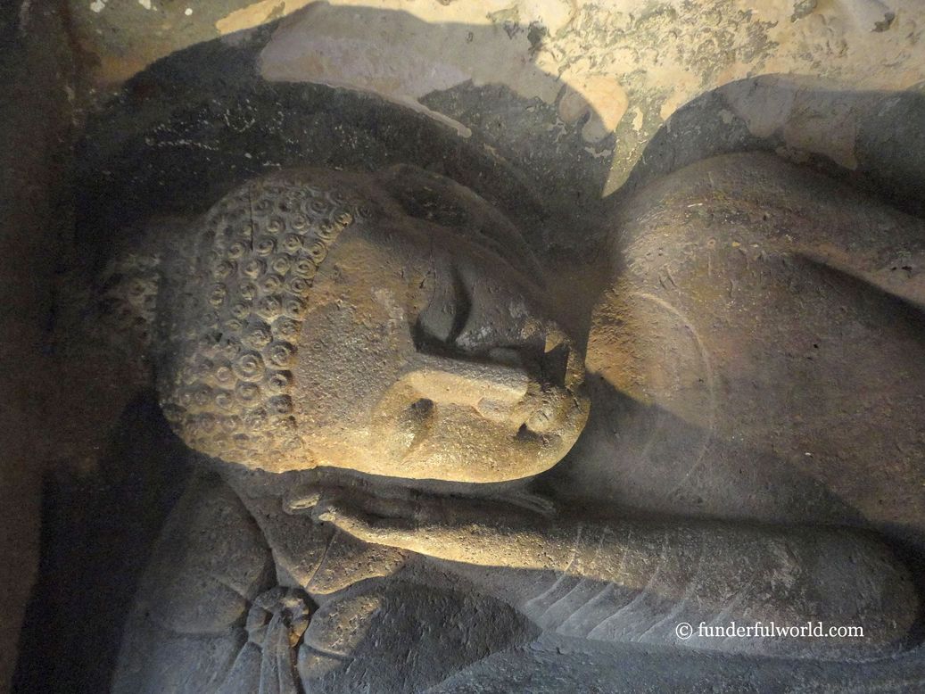 Our first destination was the last cave, Cave 26. We walked past all the other caves (encountering amused and curious glances from guards and some tourists) to reach the last one. To see the magnificent reclining Buddha. And from Cave 26, we began our journey of discovery. Over the next three to four hours, we listened to the stories narrated by every cave, from Cave 26 to Cave 11. And what an amazing journey it was! While detailed information about each cave is available at AjantaCaves.com and Wikipedia, I have chosen a few photographs to describe our experience.