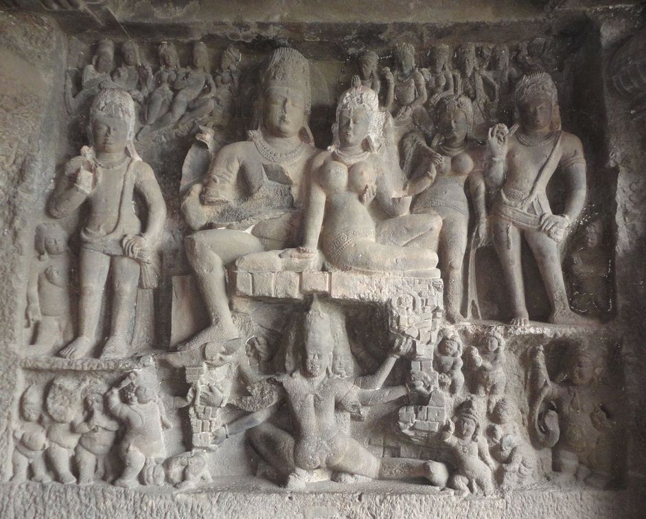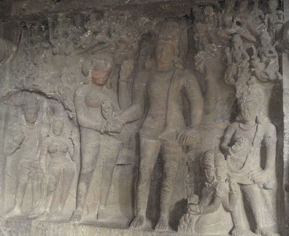 The wedding of Shiva and Parvati. Ellora Caves, Maharashtra, India