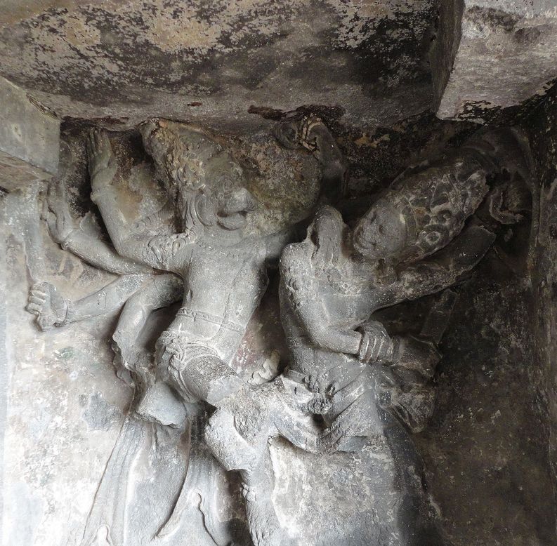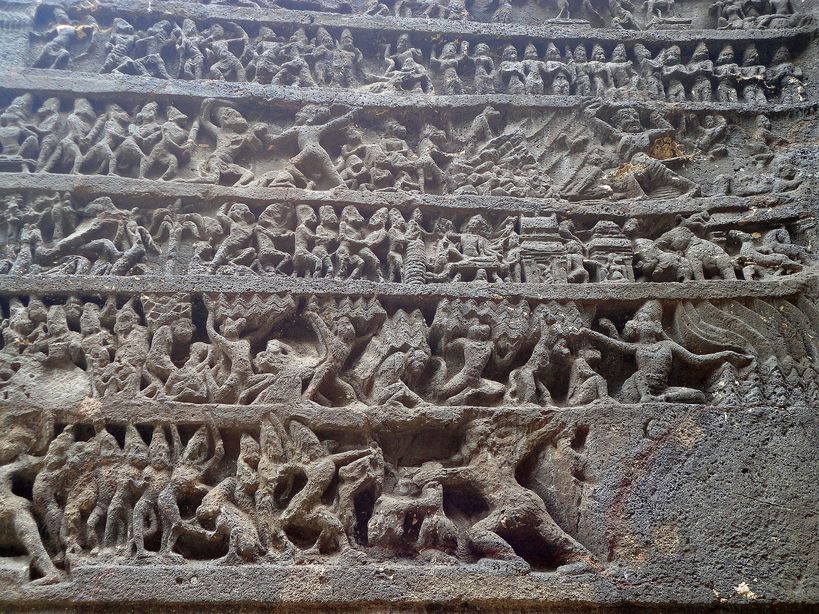 Stories from mythology at the magnificent Kailasa temple. Ellora caves, Maharashtra, India