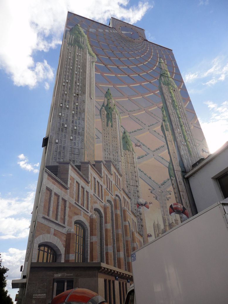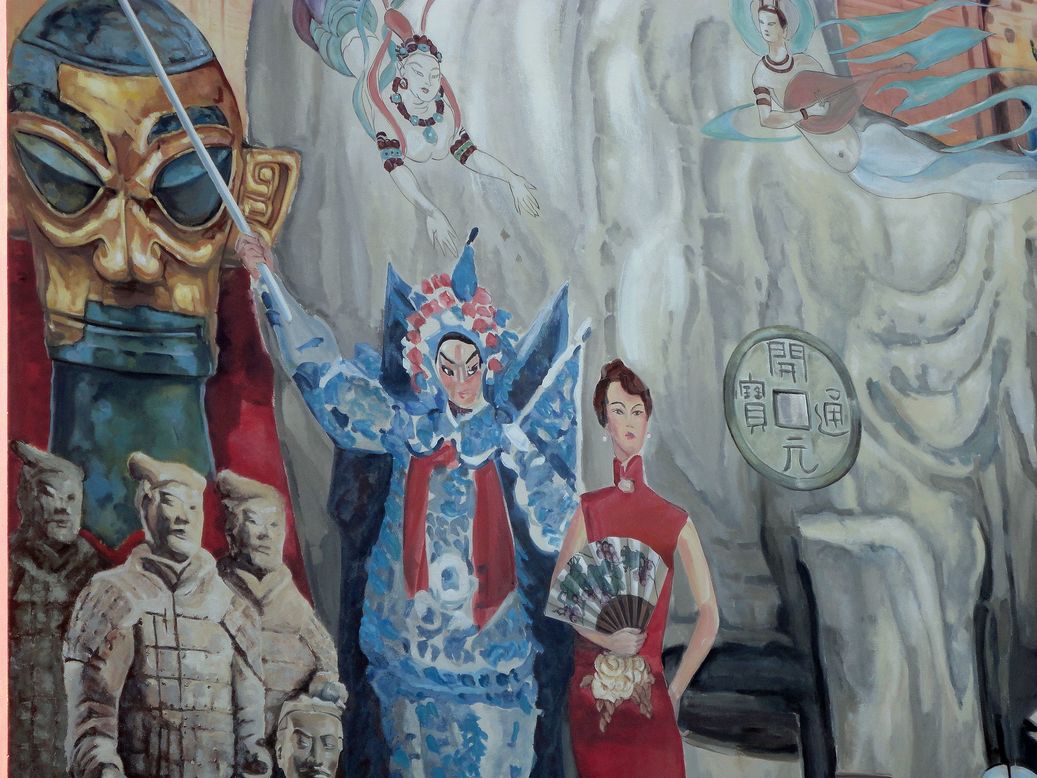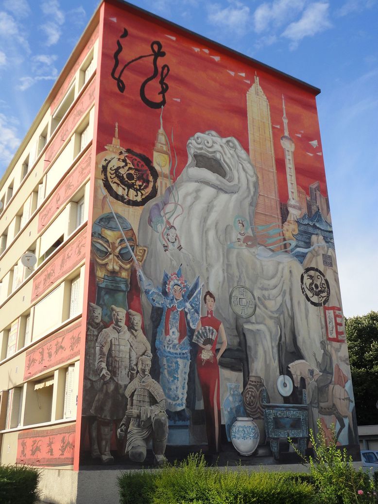 Ancient and new symbols of China jostle for space in this representation of an ideal Chinese city. The towering lion and eye-catching shade of red instantly drew our attention to the mural as we walked along the boulevard des États-Unis.