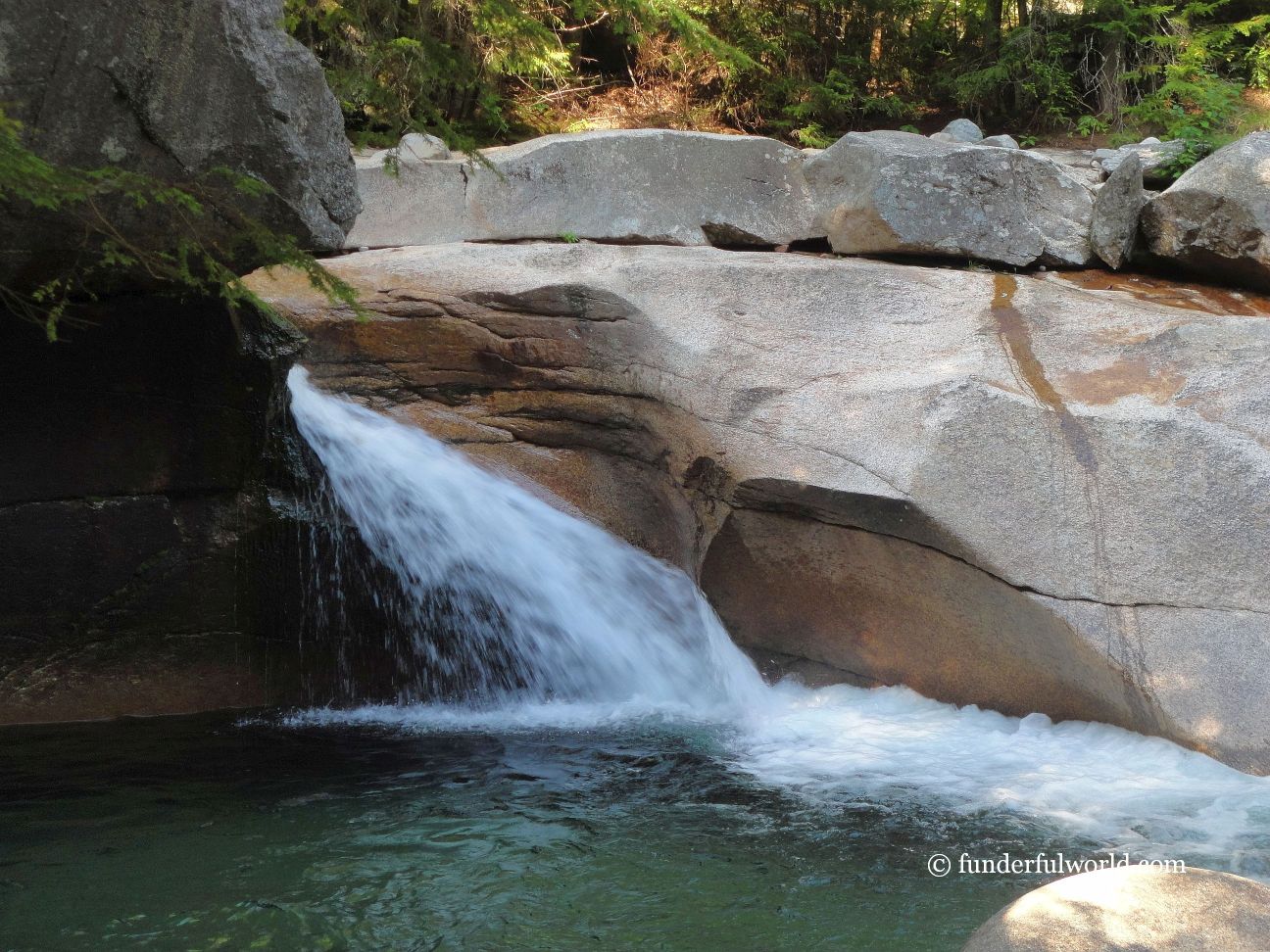 Not too far away from the Hobo Railroad in Lincoln is the picturesque Franconia Notch State Park. We picked the trail to the Basin, an easy path with beautiful views of waterfalls, streams, and tall conifers all along. The Basin is a waterfall formation with an intriguing shape formed by erosion. Along the trail, we dipped our feet into the inviting waters of a stream, only to recoil in shock at the striking chill that almost numbed our toes.