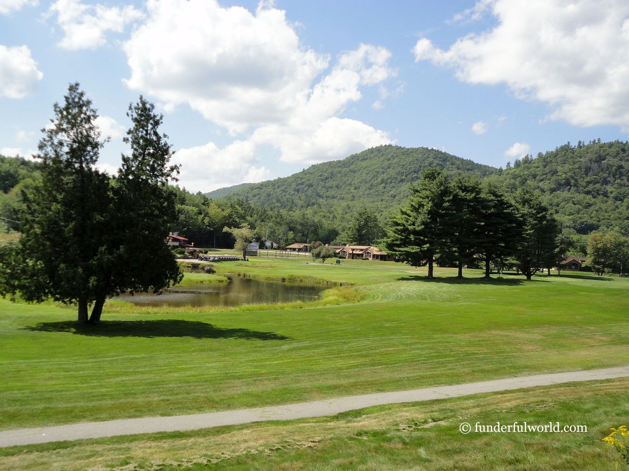Golf greens. Through the windows on the Hobo Railroad. Lincoln, New Hampshire.