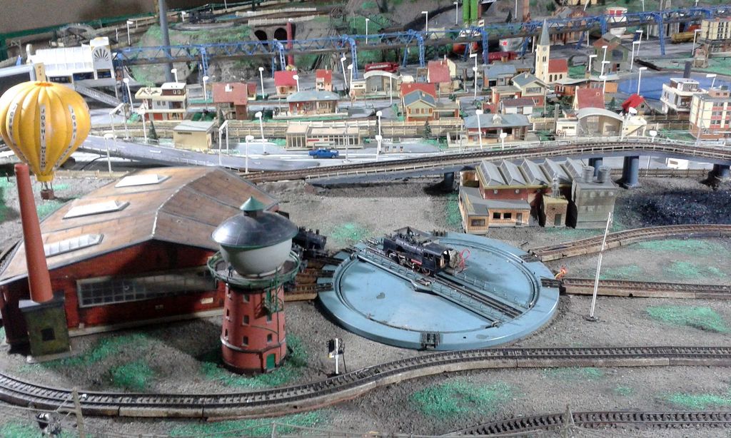 A miniature scene. With trains that chug along the tracks and a hot air balloon rising high. With a funicular and cable car that compete for attention. With tiny people enjoying a swim and others scaling a mountain.