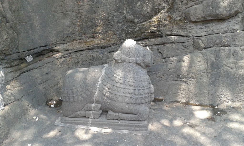 A large Nandi mandapa with many pillars stands in the courtyard. The main sanctum, part of a basalt rock cave, houses the main deity in the form of a Shivling. Other idols in the temple include those of Rama, Sita, and Lakshmana.